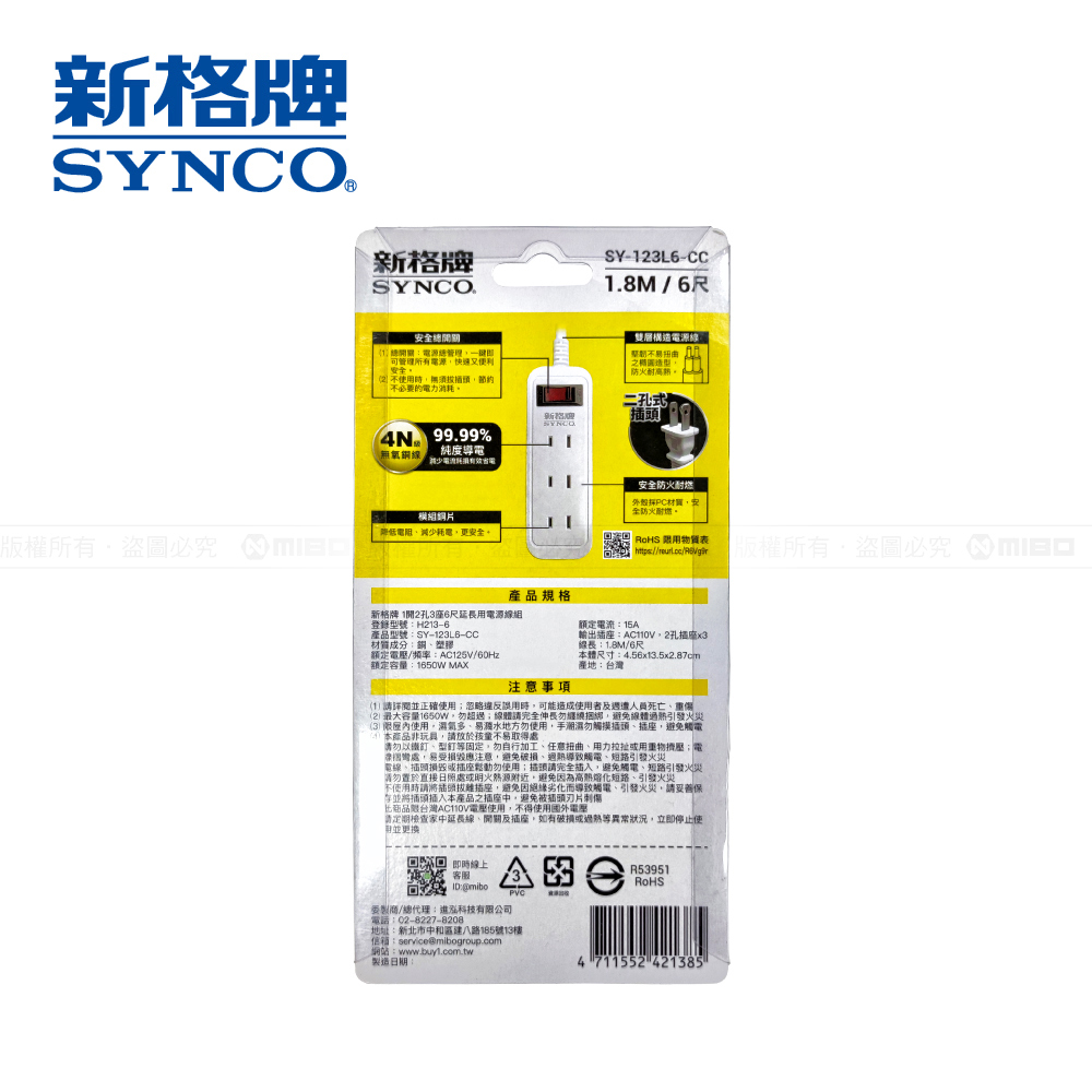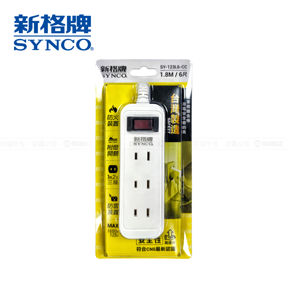 新格牌SYNCO 單開2孔3座6呎延長線1.8M