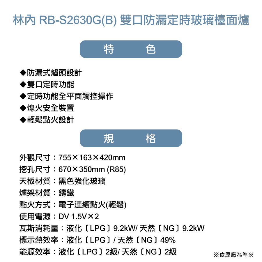 標示熱效率:液化﹝LPG﹞49%/ 天然﹝NG﹞49%