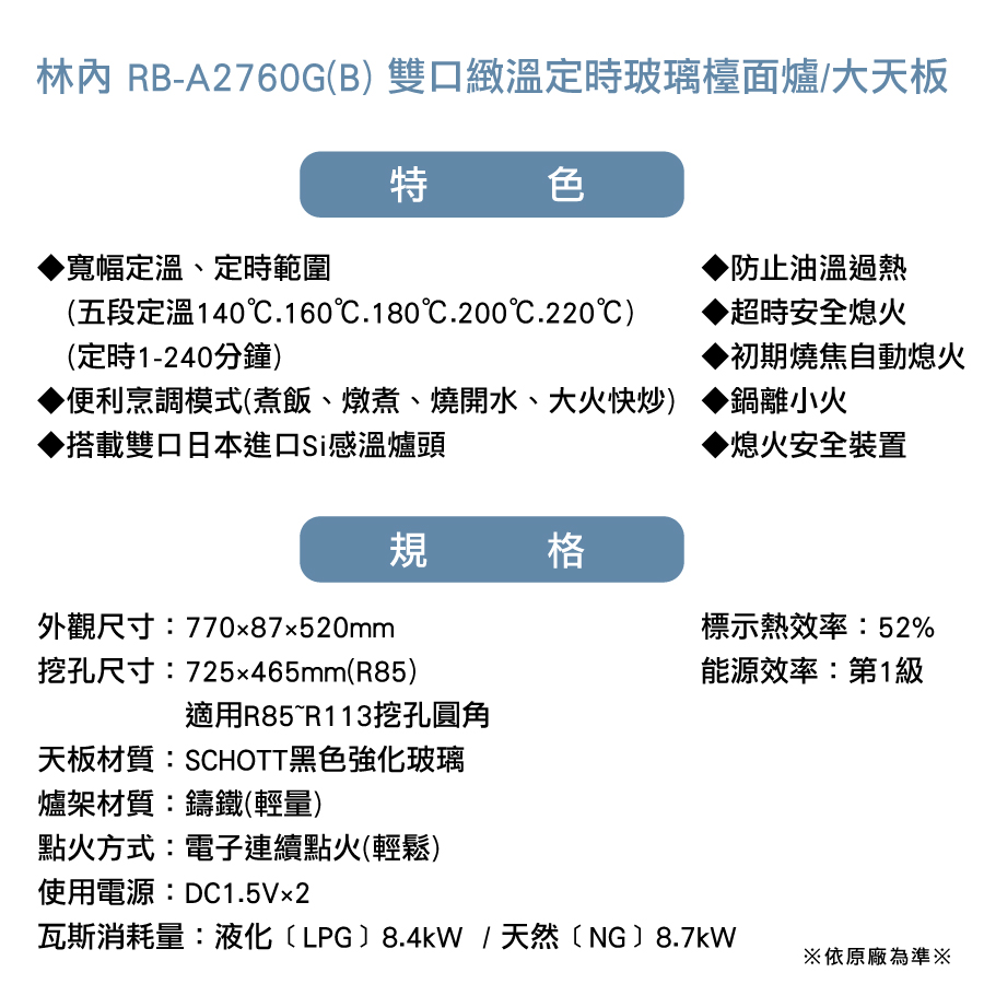 瓦斯消耗量:液化﹝LPG﹞8.4kW  / 天然﹝NG﹞8.7kW