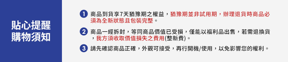 - 根據消費者保護法規定,於本網站購物的消費者,均享有商品到貨後七天猶豫期之權益,但退貨商品必須是全新狀態且完整包裝(保持產品、附件、包裝、廠商紙箱及所有附隨文件或資料之完整性),否則將收回恢復原狀費用。