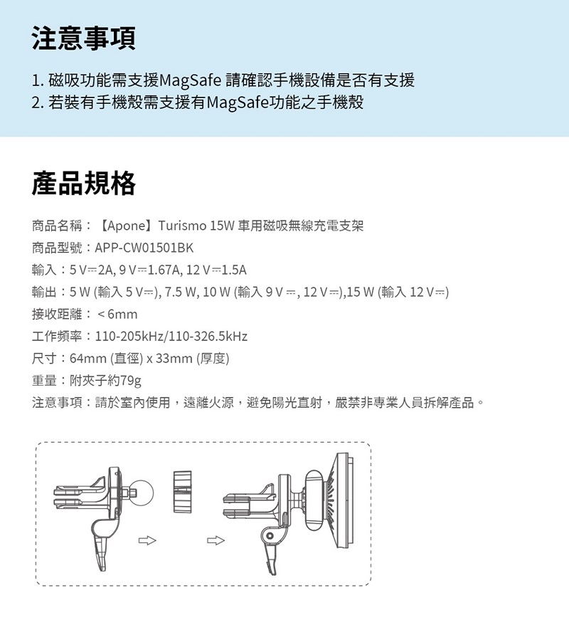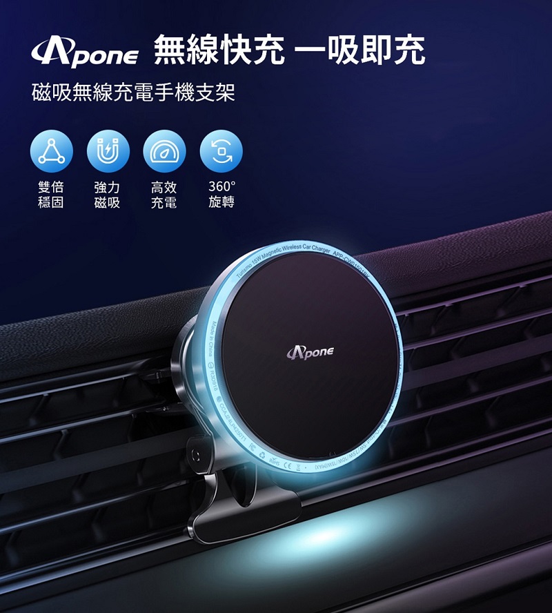 Apone Turismo360 15W車用磁吸無線充電支架