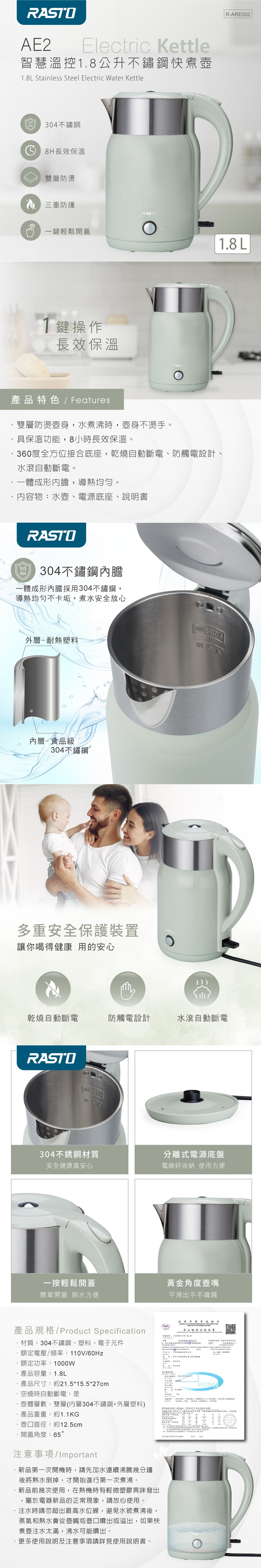 RASTO AE2 1.8L智慧溫控不鏽鋼快煮壺 - 主要圖片