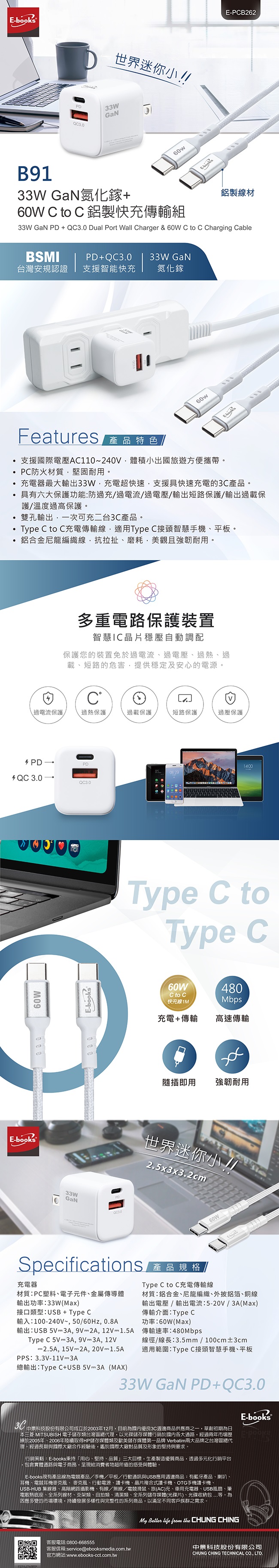 E-books B91 33W GaN+60W C to C快充傳輸組