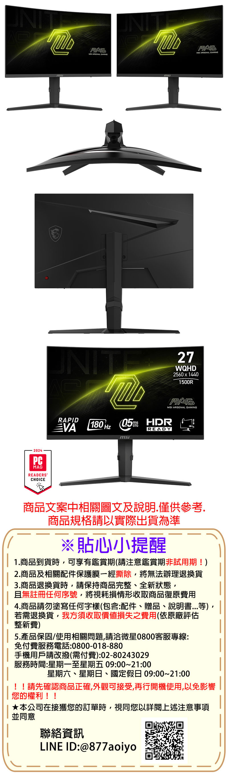 微星MSI 27型 WQHD 曲面電競螢幕-加滑鼠 (27"/2560x1440/180Hz/VA/曲面)