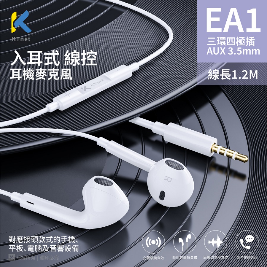 KTnet EA1四極插入耳式線控耳機-白