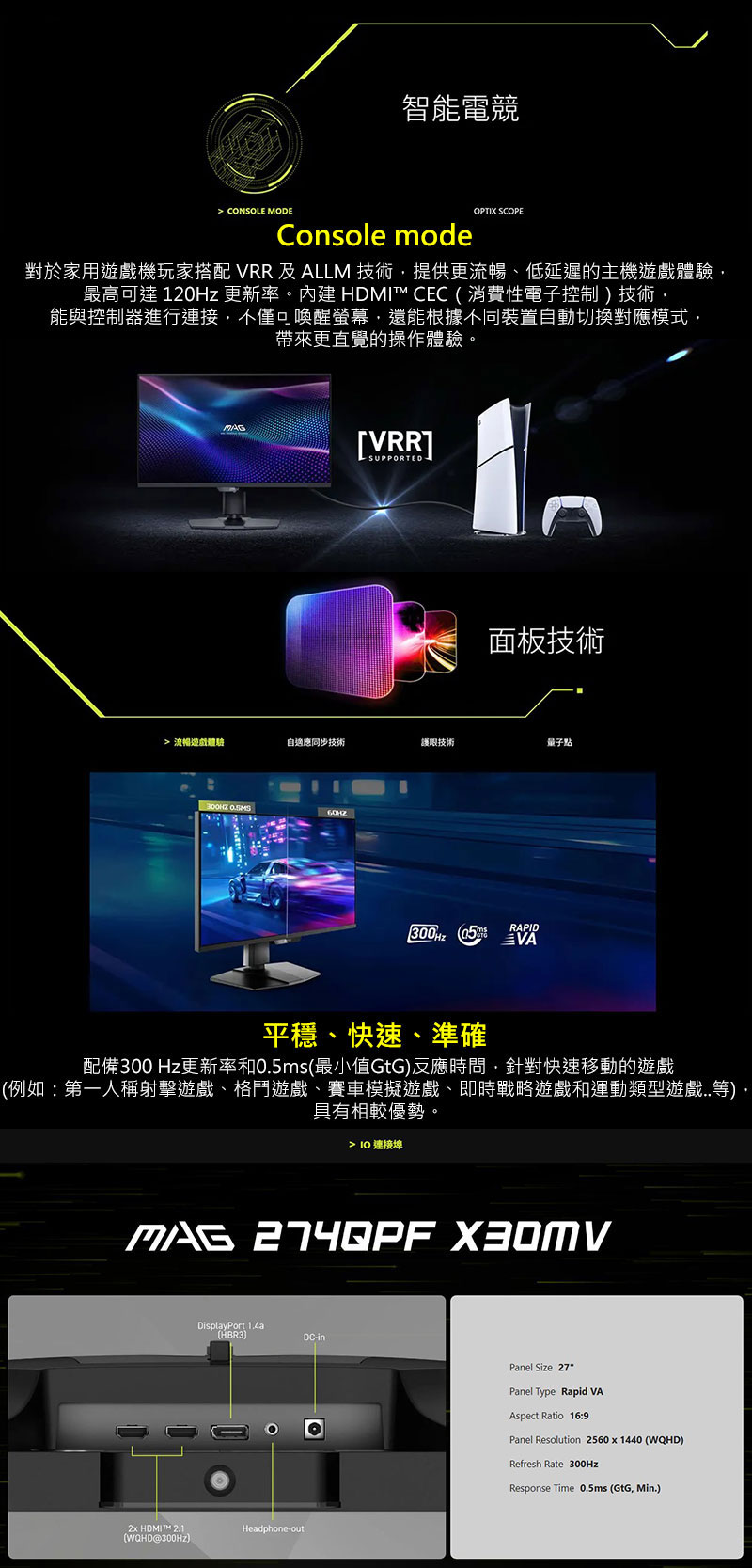 • 更新頻率:300Hz/反應時間:0.5ms (GtG)