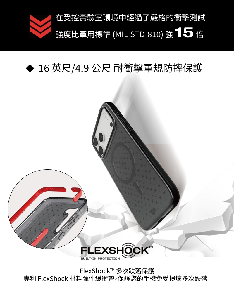 • 通過軍規防摔認證MIL-STD-810H,提供 16 英尺/4.9 公尺的防撞保護