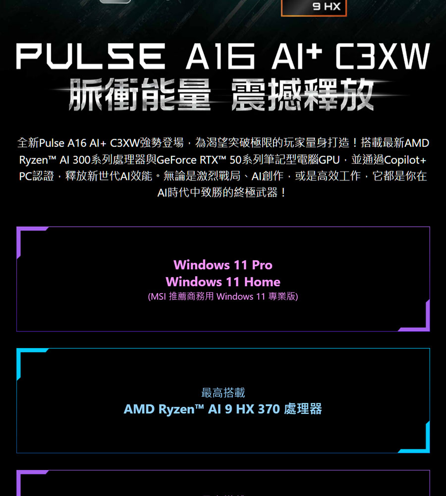 微星MSI Pulse A16 16吋 黑 電競筆電 (Ryzen AI 7/64G/2TB SSD/RTX5060/W11)特仕機