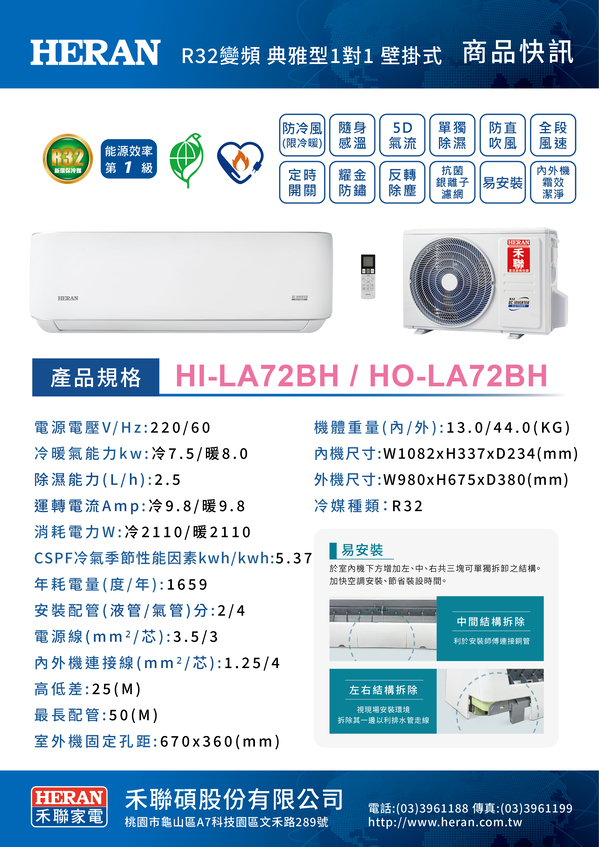 HERAN 典雅型一對一變頻冷暖空調