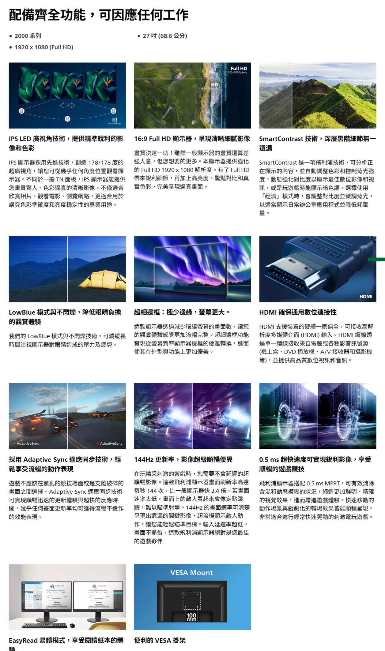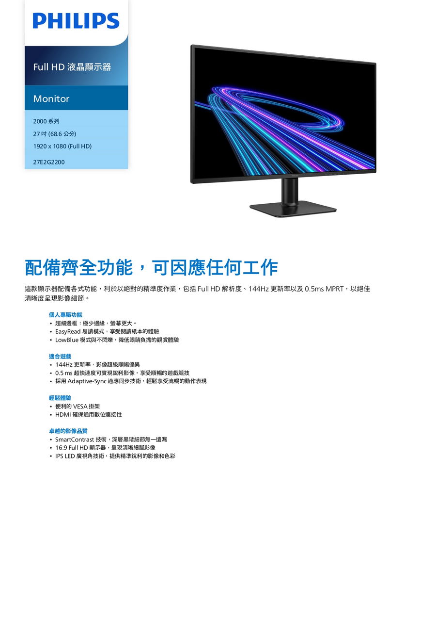 • 27吋/FHD(1920x1080)/IPS