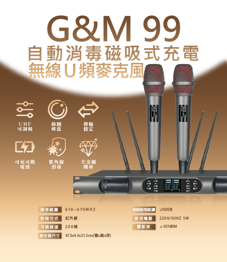 麥克風:G&M 99自動消毒磁吸式充電無線U頻麥克風X乙組