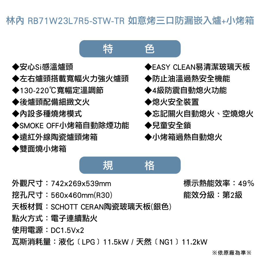 林內進口瓦斯爐(NG)三口防漏嵌入爐+小烤箱