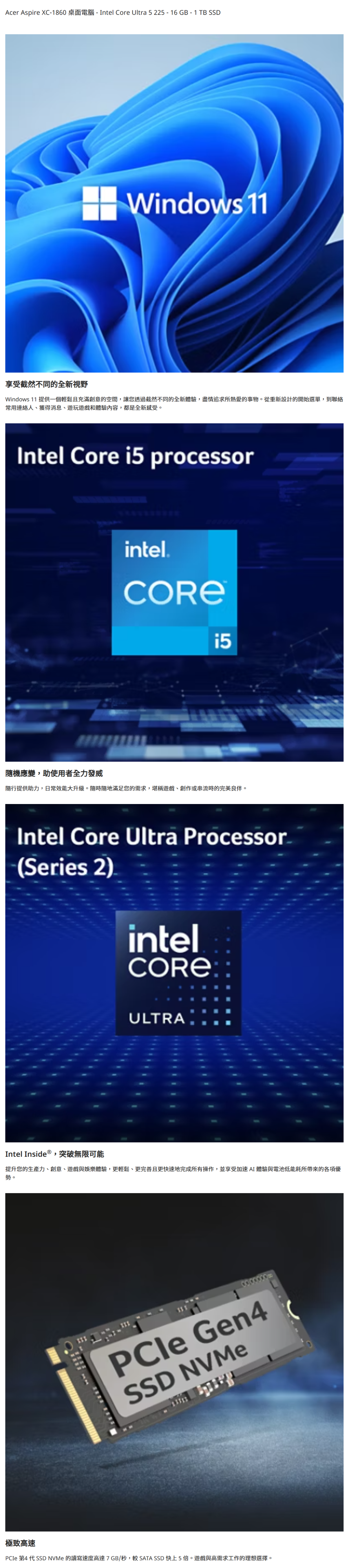 宏碁 Acer Aspire XC-1860 桌機 (Intel Core Ultra5-225/16G DDR5/1T SSD/UMA/W11/300W) 黑