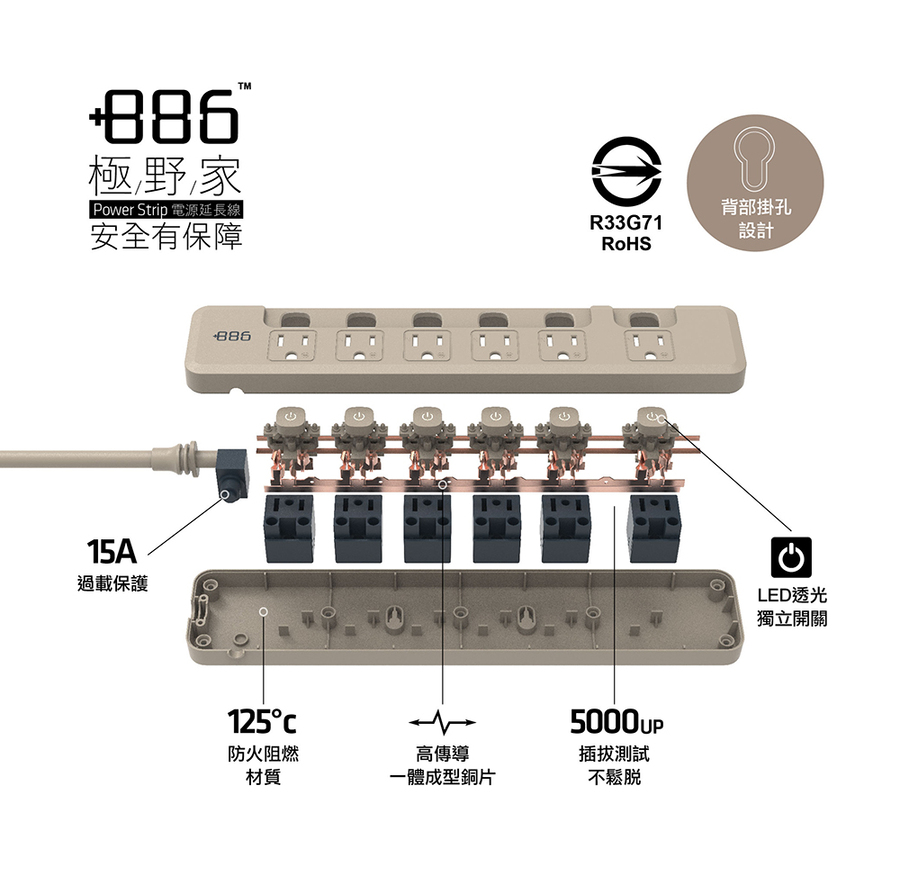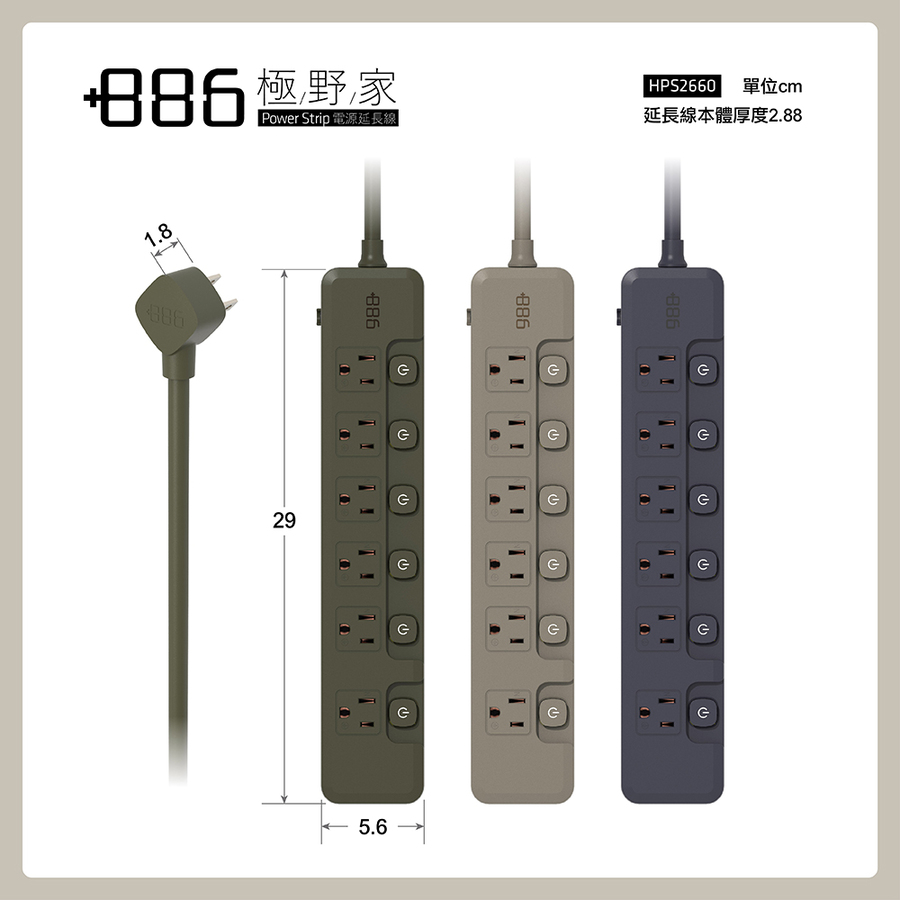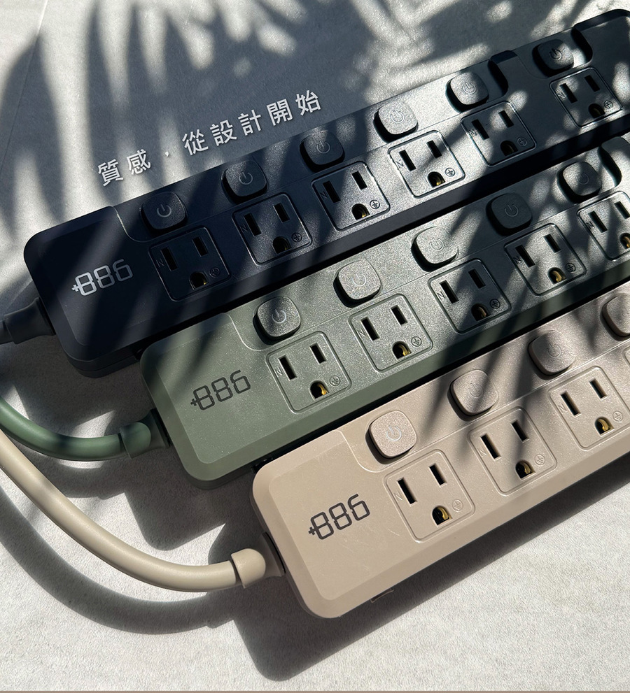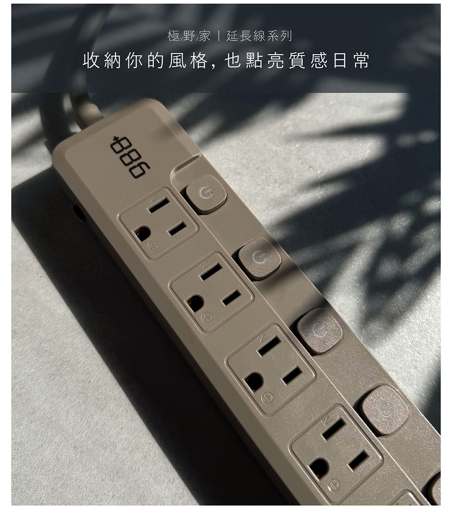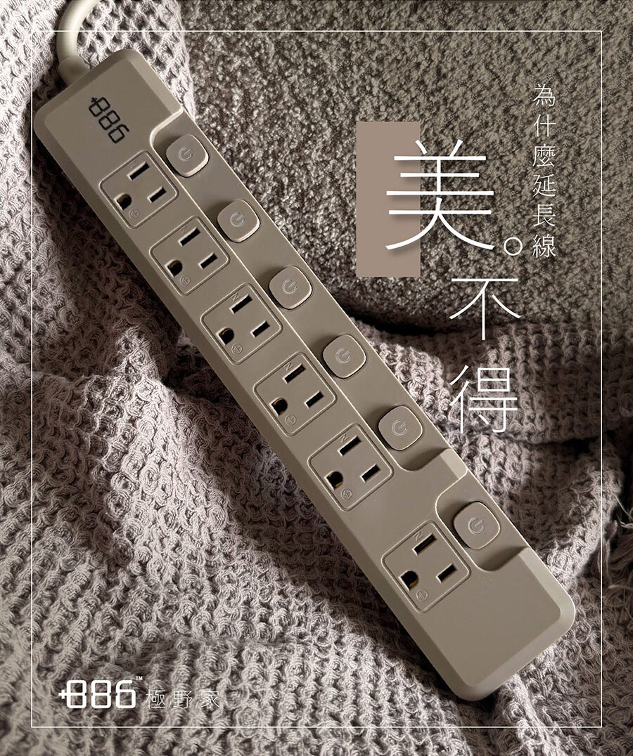 +886 6切6座3孔過載保護延長線-1.8M(奶茶)