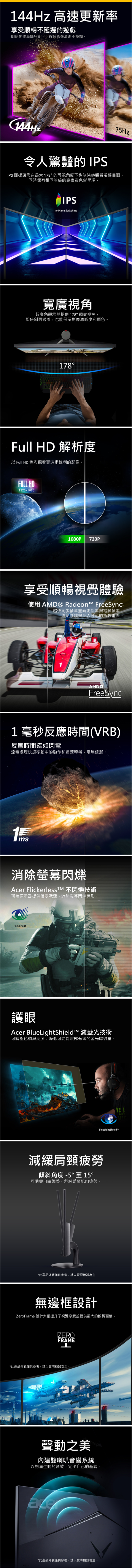 宏碁 ACER 24型 FHD IPS 護眼螢幕 (1920x1080/144Hz/250cd/1ms/VGA+HDMI+2W喇叭*2) - 細節圖 1