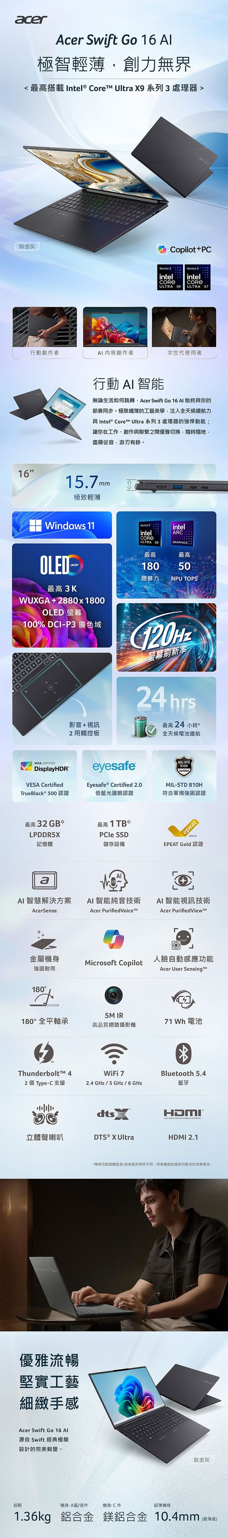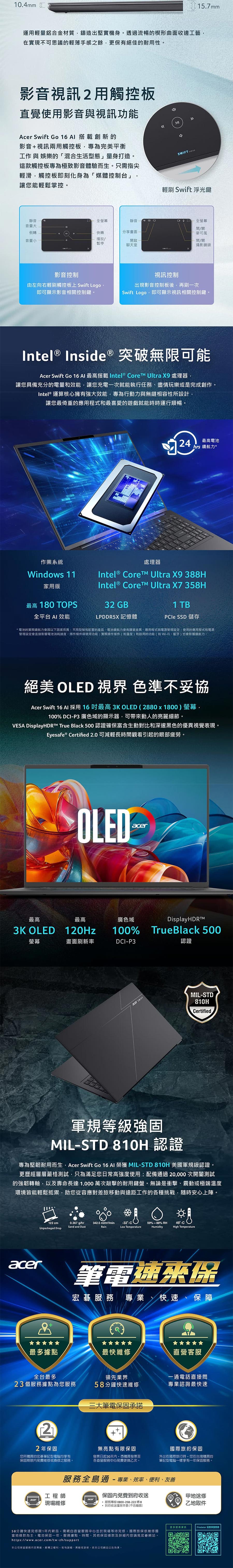 ACER Swift GO 輕薄筆電 灰 (Ultra X7-358H/32G/1TB SSD/W11)