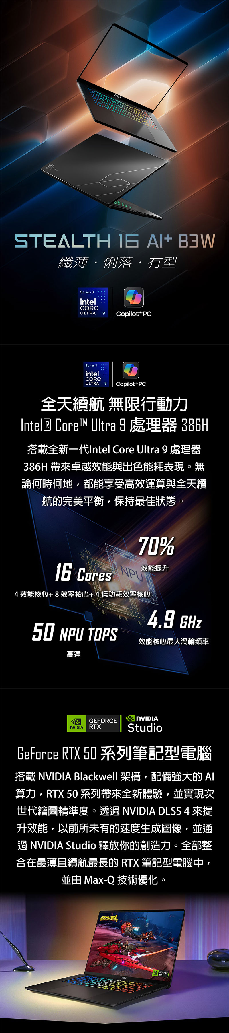 MSI Stealth 16 AI+ 電競筆電-雙碟特仕版 (Ultra 9 386H/32G/1T+1T/RTX5080/Win11P)