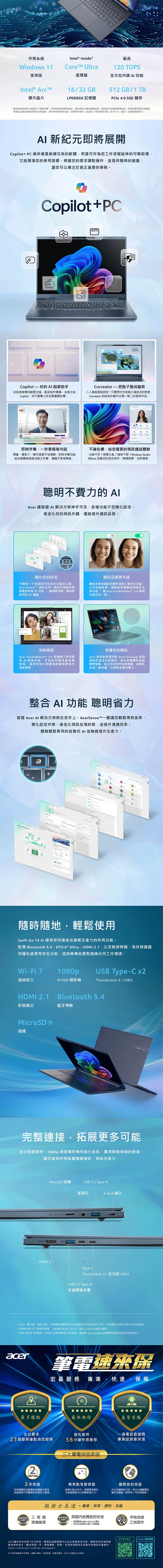 作業系統:Windows 11 Home CPU:Intel® Core™ Ultra 5 processor 226V clock/Turbo:2.1 GH/4.5 GHz Cores/Threads:8/8 Smart Cache:8 MB 晶片組: LCD : 尺寸/規格:14" 16:10/OLED/鏡面 解析度:WUXGA 1920 x 1200 色域:DCI-P3 100% 亮度:400 nits 顯示晶片:Intel® ARC™ Graphics 130V VRAM:N 風扇:2 熱導管:2 記憶體: 實際出貨:16GB LPDDR5X(Onboard) 支援容量(總插槽數量/總容量):0/16GB 儲存空間: 實際出貨:512GB PCIe Gen4 SSD 支援擴充空間(包含已安裝部分):M.2 SSD *1 光碟機:N Acer TrueHarmony:Y DTS® Audio:Y Acer Purified.Voice:Y built in speaker:Y Built-in microphone:Y 鍵盤:白色背光 "Webcam:FHD IR camera (1920 x 1080) with Temporal Noise Reduction(TNR)" "無線網路:Intel® Wi-Fi 7 802.11 a/b/g/n/ac/ax/be Band: 2.4 GHz, 5 GHz, and 6 GHz 2x2 MIMO Intel® Connectivity Performance Suite (ICPS)" 藍牙:Bluetooth® 5.4 區域網路RJ-45:N Kensington lock slot:Y(Nano-type) 尺寸(mm):312.4 (W) x 227.4 (D) x 9.7/15.95 (H) mm 材質:全機鋁合金 重量:1.24 kg 電源變壓器:100W 電池:65Wh Li-ion battery Battery Life:Up to 23.5 hours (video playback) Input/OutputCard Reader:Y(microSD™ Card reader) USB Type-C:2(USB4® 40Gbps)(Thunderbolt 4)(DC-in 20 V; 65W or 100 W) Type-C 支援影像傳輸:Y USB Type-A:2(USB 3.2 Gen 1) HDMI:Y(HDMI 2.1) External display (VGA) port:N DisPlay Port:N 可外接螢幕數量:3 耳機/喇叭輸出:Y(與耳機/喇叭輸出共用jack) 麥克風輸入:Y(與耳機/喇叭輸出共用jack) 安全指紋辨識:N TPM:N 保固:台灣2年