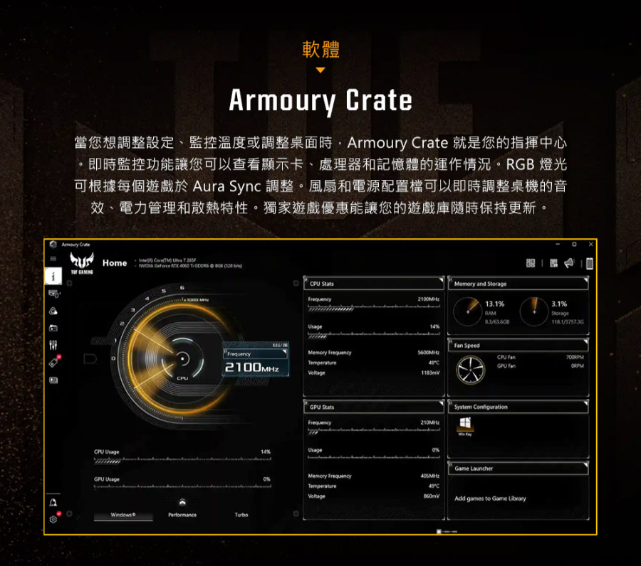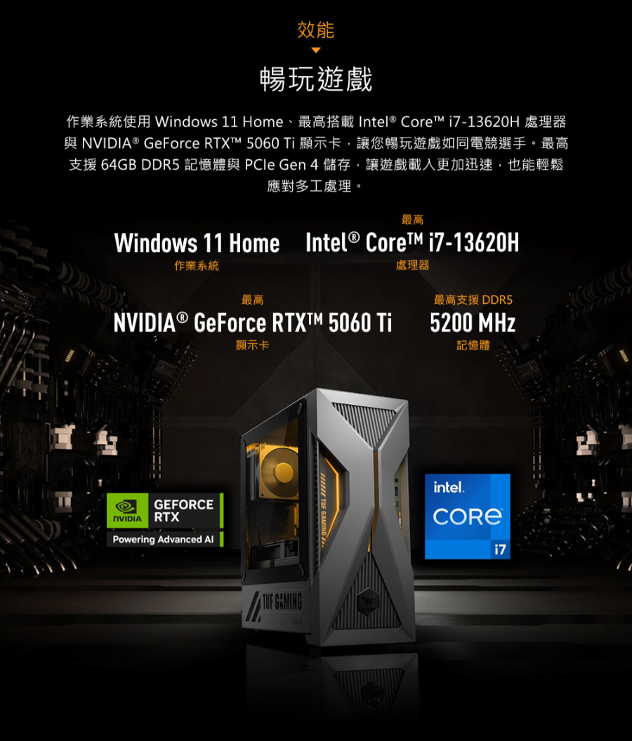 處理器:Intel® Core™ i5-13420H Processor 2.1 GHz (12MB Cache, up to 4.6 GHz, 8 cores, 12 Threads) 記憶體:16GB DDR5 SO-DIMM (Max 64GB) 硬碟:1TB M.2 2280 NVMe™ PCIe® 4.0 SSD 顯示晶片:NVIDIA® GeForce RTX™ 5060 DUAL 8GB GDDR7 : 3xDP, 1x HDMI 光碟機:無 讀卡機:無 鍵鼠組:Gaming RGB Keyboard(USB) Gaming RGB Mouse(USB) 音效:High Definition 7.1 Channel Audio 無線網路:Wi-Fi 6(802.11ax) (Dual band) 2*2 Bluetooth® 5.4 Wireless Card 有線網路:Intel WGI219V 10/100/1000 Mbps, non-vPro 電源供應:330W power supply (80 Platinum, peak 660W) 作業系統:Windows 11 家用版 (64 bit) 保固:原廠三年保固/到府收送(免費第一年到府維修)
