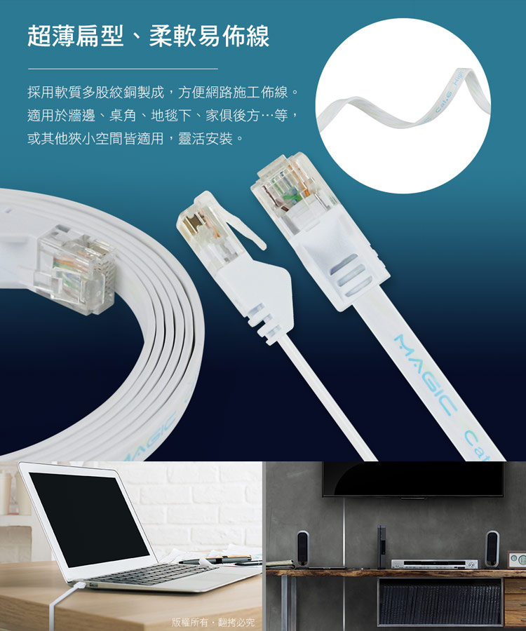 MAGIC Cat.6 Hight-Speed 1.4mm超薄扁平網路線 超薄扁平設計,採用軟質多股絞銅製成 方便網路施工佈線,適用於電腦主機與集線器之連接 最高可提供至1GB傳輸速度及350Mhz之高頻寬表現,確保網路訊號的最佳傳輸。 Gigabyte超高網路傳輸速度,適用於各種網路環境, 並且相容於Cat.5、Cat.5e、Cat.6之網路規格。 本品適用於牆壁、地毯下、家具背後…等,或其他狹小空間皆適用