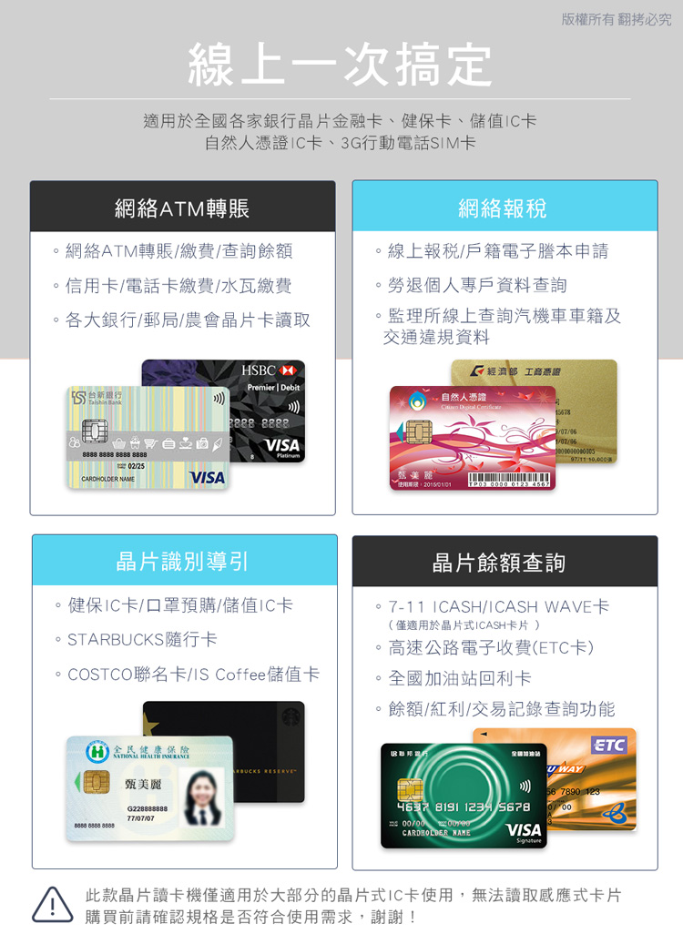 ◆支援 Win 10/11 & MacOS 作業系統 ◆桌上型直立式插卡,不佔空間 ◆網路ATM轉帳、網路報稅皆適用 ◆支援勞動保障卡/工商憑證 之查詢 ◆支援儲值晶片卡餘額查詢
