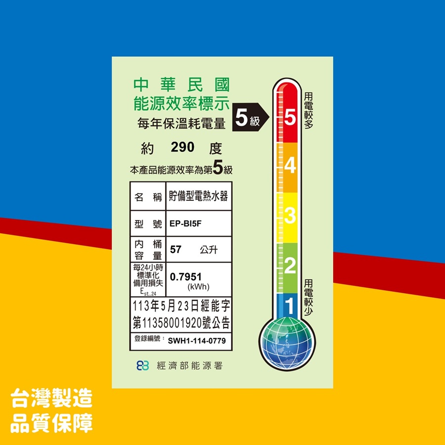型號:EP-BI5F 容量:15加侖 橫掛式 用電:4Kw /220V /約18安培 產地:台灣 適用人數:連續淋浴約1~2人 直徑高度:43 X 74公分(依實品為主) 電熱管材質:銅製電熱管 熱水器材質:不鏽鋼(內桶304/外桶430) 進出水口:1/2"(4分進出水口)