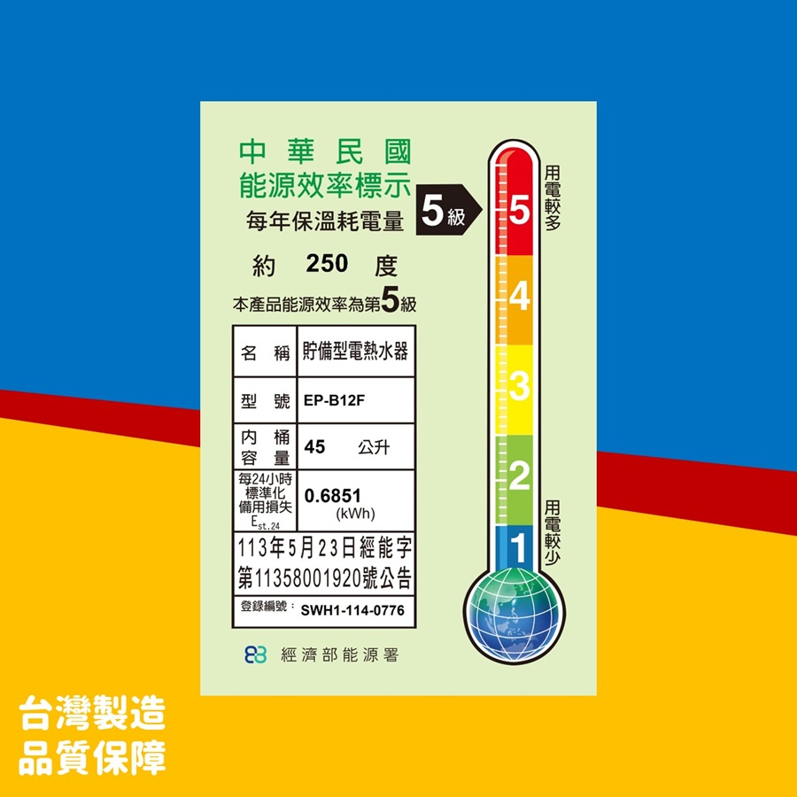 型號:EP-B12F 容量:12加侖 橫掛式 用電:4Kw /220V /約18安培 產地:台灣 適用人數:連續淋浴約1人 直徑高度:39 X 73公分(依實品為主) 電熱管材質:銅製電熱管 熱水器材質:不鏽鋼(內桶304/外桶430) 進出水口:1/2"(4分進出水口)