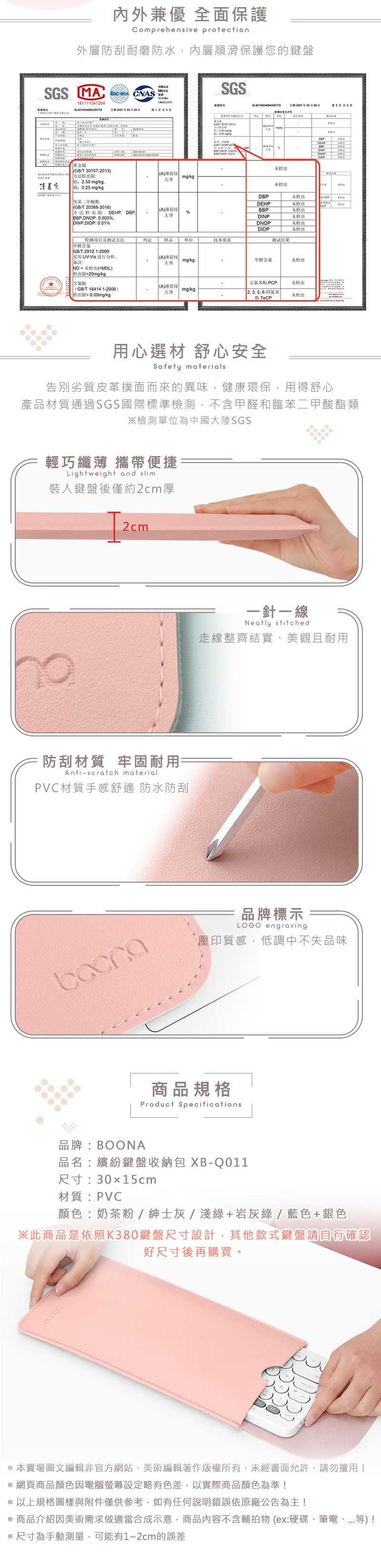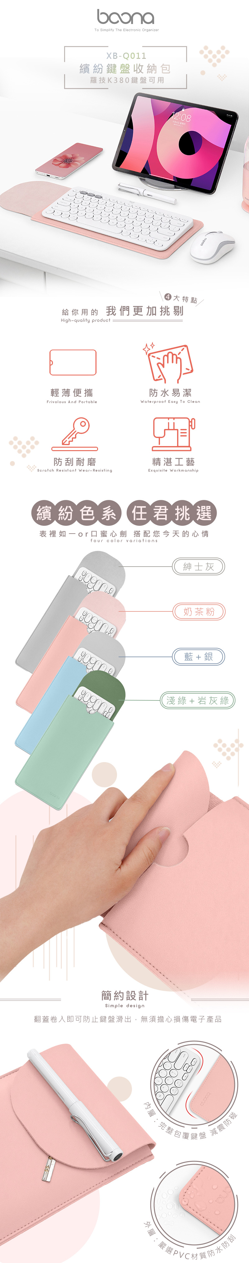 品牌:BOONA 品名:繽紛鍵盤收納包 XB-Q011 尺寸:30×15cm 材質:PVC 重量:約150g 顏色:奶茶粉/紳士灰/淺綠 岩灰綠/藍色 銀色 注意事項:此商品是依照K380鍵盤尺寸設計,其他款式鍵盤請自行確認好尺寸後再購買。 --- ◎ 本賣場圖文編輯非官方網站,美術編輯著作版權所有,未經書面允許,請勿擅用! ◎ 網頁商品顏色因電腦螢幕設定略有色差,以實際商品顏色為準! ◎ 以上規格圖樣與附件僅供參考,如有任何說明錯誤依原廠公告為主! ◎ 商品介紹因美術需求做適當合成示意,商品內容不含輔拍物 (ex:鍵盤、平板、...等)! ◎ 尺寸為手動測量,可能有1~2cm的誤差