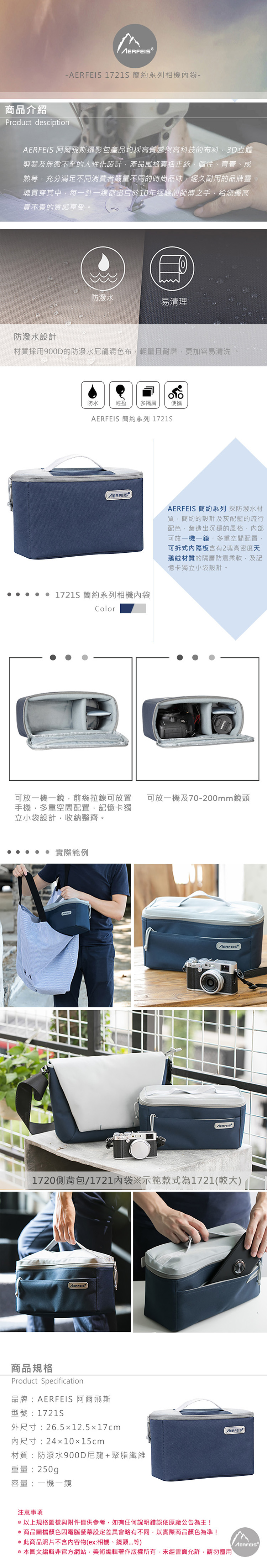 品牌:AERFEIS 阿爾飛斯 型號:1721S 外尺寸:26.5×12.5×17cm 內尺寸:24×10×15cm 材質:防潑水900D尼龍 聚脂纖維 重量:250g 容量:一機一鏡