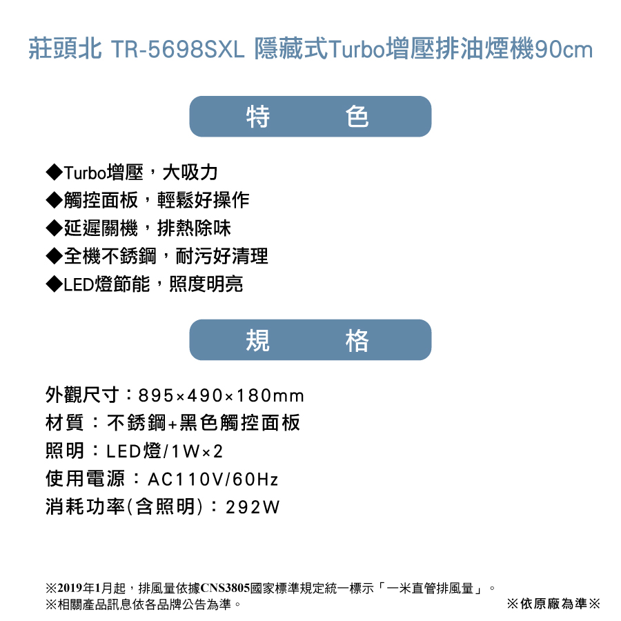 機型:TR-5698SXL 品名:隱藏式不銹鋼Turbo增壓排油煙機90cm