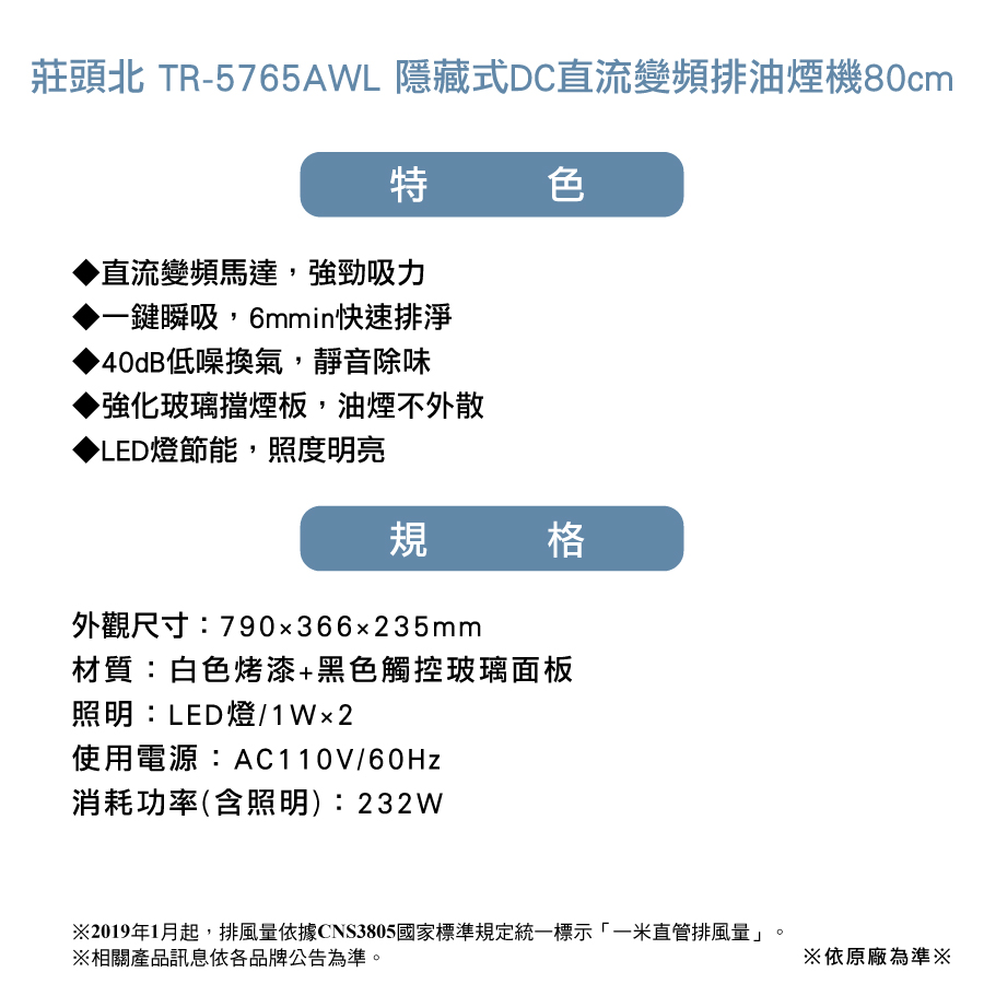 機型:TR-5765AWL 品名:隱藏式DC直流變頻排油煙機80cm
