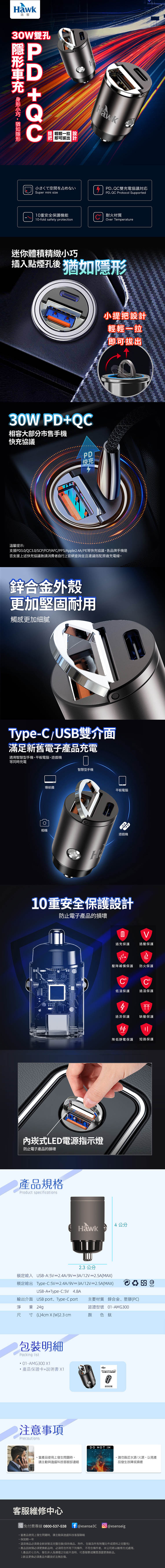 額定輸入:DC 12V-24V, 3.0A 額定輸出: USB-A:5V?2.4A/9V?3A/12V?2.5A(MAX) Type-C:5V?2.4A/9V?3A/12V?2.5A(MAX) USB-A Type-C:5V?4.8A 輸出介面: USB port、Type-C port 淨重:24g 尺寸:(L)40mm X (W)23 mm 材質:鋅合金、塑膠(PC)