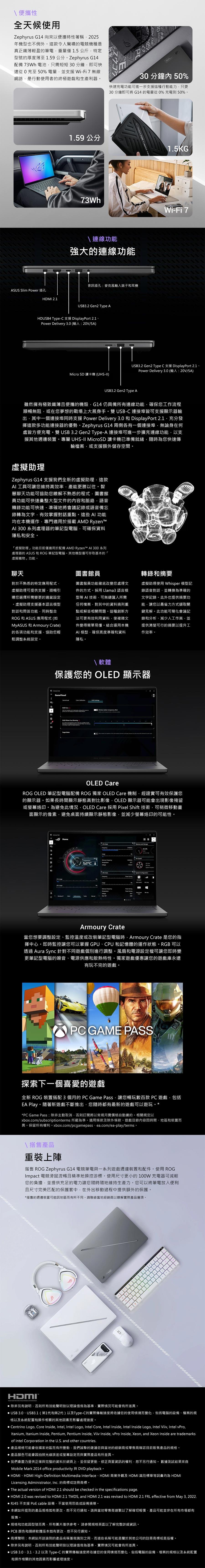 顏色:Platinum White LCD尺寸:14-inch / 3K (2880 x 1800) OLED 16:10 aspect ratio / 120Hz / OLED / ROG Nebula Display 處理器:AMD Ryzen™ AI 9 HX 370 Processor 2.0GHz (36MB Cache, up to 5.1GHz, 12 cores, 24 Threads);AMD XDNA™ NPU up to 50TOPS 記憶體:64GB LPDDR5X 8000 on board(Actual memory speeds may vary by CPU configuration.) (Support dual channel memory) (Memory Slot / Memory Max.):(N/A / 64GB) 硬碟:1TB PCIe® 4.0 NVMe™ M.2 SSD (M.2 slots support either SATA or NVMe / Expansion Slot (includes used)):(1 / 1x M.2 PCIe) 獨立顯卡:NVIDIA® GeForce RTX™ 5070 Ti Laptop GPU 12GB GDDR7 .Discrete/Optimus:MUX Switch NVIDIA® Advanced Optimus 無線網路:Wi-Fi 7(802.11be) (Triple band) 2*2 Bluetooth® 5.4 Wireless Card (*Bluetooth® version may change with OS version different.) 電池:73WHrs, 4S1P, 4-cell Li-ion AC Adapter:Rectangle Conn, 200W AC Adapter, Output: 20V DC, 10A, 200W, Input: 100-240V AC, 50/60Hz universal 攝影機:1080P FHD IR Camera for Windows Hello 音效:Built-in 3-microphone array, 4-speaker (dual force woofer) system with Smart Amplifier Technology, 2 Tweeters, AI noise-canceling technology, Dolby Atmos, Hi-Res certification (for headphone), Smart Amp Technology 尺寸:31.1 x 22.0 x 1.59 ~ 1.83 cm 重量:1.57 Kg 作業系統:Windows 11 Home -------------------------------------------- ●輸入輸出介面(I/O): -------------------------------------------- 1x Type-C USB 4 with support for DisplayPort™ / power delivery (data speed up to 40Gbps) 1x USB 3.2 Gen 2 Type-C with support for DisplayPort™ / power delivery / G-SYNC (data speed up to 10Gbps) 2x USB 3.2 Gen 2 Type-A (data speed up to 10Gbps) 1x card reader (microSD) (UHS-II) 1x HDMI 2.1 FRL 1x 3.5mm Combo Audio Jack Built-in 3-microphone array