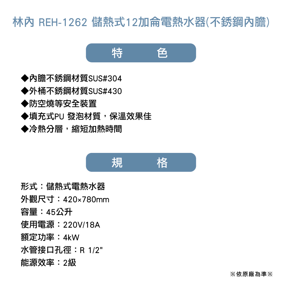 型號:REH-1262 品名:儲熱式12加侖電熱水器(不銹鋼內膽)