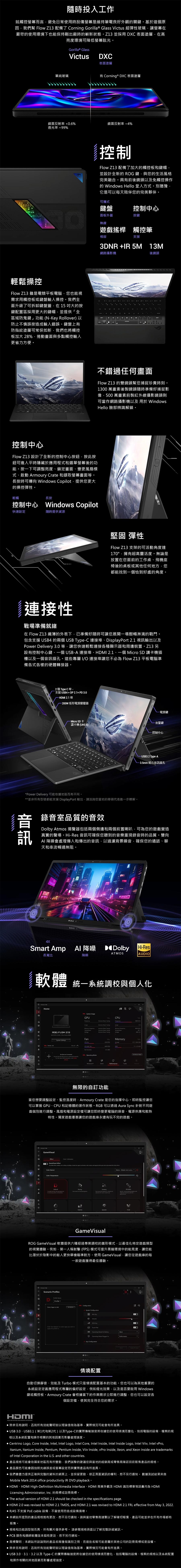 LCD尺寸:13.4 "(薄邊框) / 2.5K (2560 x 1600, WQXGA) / 180Hz / IPS-level / DCI-P3 100% / Adaptive-Sync / Pantone 認證/Dolby Vision/Glossy display / ROG Nebula Display 處理器:AMD Ryzen™ AI MAX 395 Processor 3.0GHz (80MB Cache, up to 5.1GHz, 16 cores, 32 Threads);AMD XDNA™ NPU up to 50TOPS 記憶體:128GB LPDDR5X 8000 on board (Actual memory speeds may vary by CPU configuration.) (Memory Slot / Memory Max.):(N/A / 128GB) 硬碟:1TB PCIe® 4.0 NVMe™ M.2 SSD (2230) (M.2 slots support either SATA or NVMe / M.2 SSD Support List):(N/A / M.2 2230 PCIE SSD) 顯示晶片:AMD Radeon™ Graphics 無線網路:Wi-Fi 7(802.11be) (Triple band) 2*2 Bluetooth® 5.4 Wireless Card (*Bluetooth® version may change with OS version different.) 電池:70WHrs, 4S1P, 4-cell Li-ion AC Adapter:Rectangle Conn, 200W AC Adapter, Output: 20V DC, 10A, 200W, Input: 100-240V AC, 50/60Hz universal 攝影機:13MP camera and 5MP IR camera 音效:Built-in 3-microphone array, 2x 2W dual-force with Smart Amp Technology, Dolby Atmos, Hi-Res certification (for headphone), Smart Amp Technology 尺寸:30.0 x 20.4 x 1.30 ~ 1.49 cm 重量:1.20 Kg 作業系統:Windows 11 Home -------------------------------------------- ●輸入輸出介面(I/O): -------------------------------------------- 1x USB 3.2 Gen 2 Type-A (data speed up to 10Gbps) 2x Type-C USB 4 with support for DisplayPort™ / power delivery (data speed up to 40Gbps) 1x card reader (microSD) (UHS-II) 1x HDMI 2.1 FRL 1x 3.5mm Combo Audio Jack Built-in 3-microphone array Backlit Chiclet Keyboard 1-Zone RGB