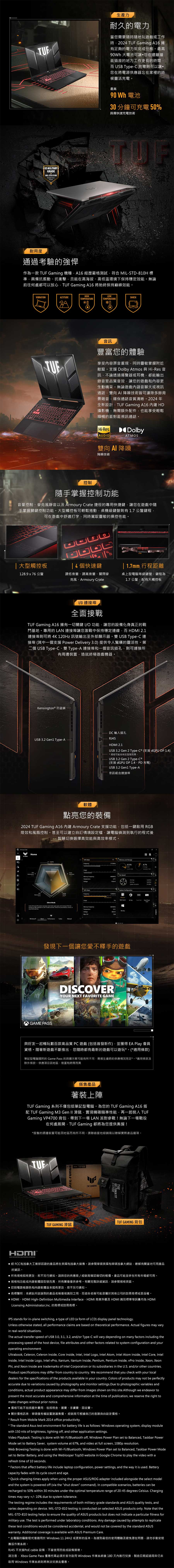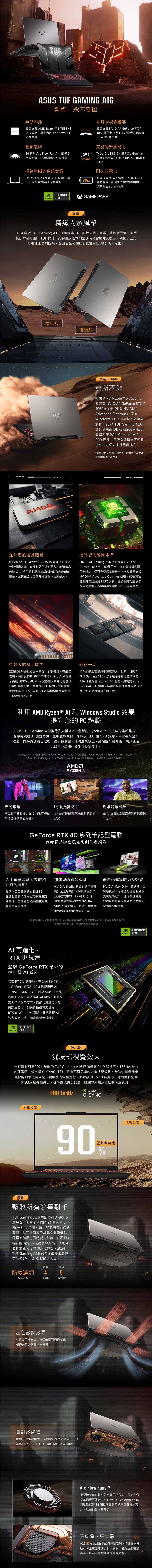 LCD尺寸:16" (薄邊框) / FHD 16:10 (1920 x 1200, WUXGA) / 165Hz / 3ms / IPS-level / Anti-glare / SRGB 100% / G-Sync 處理器:AMD Ryzen™ 7 7445HS Processor 3.2GHz (22MB Cache, up to 4.7GHz, 6 cores, 12 Threads) 記憶體:16GB DDR5-5600 SO-DIMM, the memory speed of the systems vary by CPU SPEC (Support dual channel memory) (Memory Slot / Memory Max.):(2x SO-DIMM slots / 64GB) 硬碟:512GB PCIe® 4.0 NVMe™ M.2 SSD (M.2 slots support either SATA or NVMe):2 Expansion Slot (includes used): 2x DDR5 SO-DIMM slots 2x M.2 PCIe 獨立顯卡:NVIDIA® GeForce RTX™ 4050 6GB GDDR6 (具備MUX獨顯直連) .Graphic Wattage:2420MHz* at 140W (2370MHz Boost Clock 50MHz OC, 115W 25W Dynamic Boost) 無線網路: Wi-Fi 6(802.11ax) (Dual band) 2*2 Bluetooth® 5.3 Wireless Card (*Bluetooth® version may change with OS version different.) Wi-Fi 6(802.11ax) (Dual band) 2*2 Bluetooth® 5.2 Wireless Card (*Bluetooth® version may change with OS upgrades.) 電池:56WHrs, 4S1P, 4-cell Li-ion AC Adapter:?6.0, 240W AC Adapter, Output: 20V DC, 12A, 240W, Input: 100~240C AC 50/60Hz universal 攝影機:720P HD camera 音效:Built-in array microphone, 2-speaker system, AI noise-canceling technology, Dolby Atmos, Hi-Res certification (for headphone), Support Microsoft Cortana near field/far field (Microsoft service suspended in spring of 2023.) 尺寸:35.4 x 25.1 x 2.24 ~ 2.67 cm 重量:2.20 Kg 作業系統:Windows 11 Home -------------------------------------------- ●輸入輸出介面(I/O): -------------------------------------------- 1x RJ45 LAN port 1x Type-C USB 4 with support for DisplayPort™ / power delivery (data speed up to 40Gbps) 1x USB 3.2 Gen 2 Type-C with support for DisplayPort™ / power delivery / G-SYNC (data speed up to 10Gbps) 2x USB 3.2 Gen 1 Type-A (data speed up to 5Gbps) 1x HDMI 2.1 FRL 1x 3.5mm Combo Audio Jack Built-in array microphone