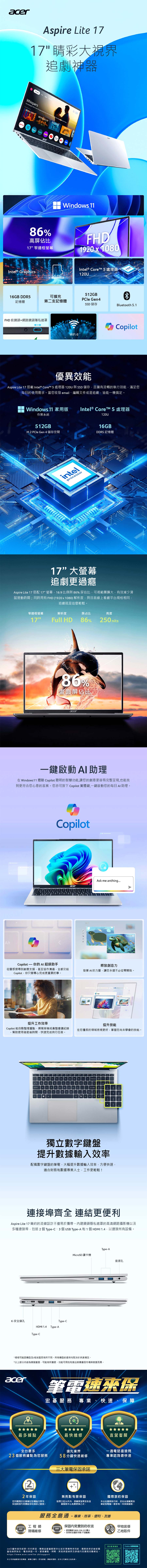 作業系統:Windows 11 Home CPU:Intel® Core™ 5 processor 120U clock/Turbo:1.4 GHz/5.0 GHz Cores/Threads:10/12 Smart Cache:12 MB 晶片組:N 尺寸/規格:17.3" IPS/霧面/LED背光 解析度:FHD 1920 x 1080 色域:NTSC 45% 亮度:250 nits 顯示晶片:Intel® Graphics VRAM:N 實際出貨:16GB DDR5 支援容量(總插槽數量/總容量):2/32GB 實際出貨:512GB PCIe Gen4 SSD 支援擴充空間(包含已安裝部分):M.2 SSD *1 built in speaker:Y Built-in microphone:Y 鍵盤:無背光 Webcam:2M FHD Camera "無線網路:802.11a/b/g/n/ac ax Dual Band (2.4 GHz and 5 GHz) 2x2 MU-MIMO" 藍牙:Bluetooth® 5.1 區域網路RJ-45:N Kensington lock slot:Y 尺寸(mm):396.4 (W) x 249.9 (D) x 19.9 (H) mm 材質:塑膠 重量:2.0 kg 電源變壓器:65W TypeC 電池:58Wh battery Battery Life:Battery life up to 8 hours Input/OutputCard Reader:Y(microSD™ Card reader) USB Type-C:1(USB 3.2 Gen 1)(DC-in port 20 V; 65 W) Type-C 支援影像傳輸:N USB Type-A:3(USB 3.2 Gen 1) HDMI:Y(HDMI 1.4) External display (VGA) port:N DisPlay Port:N 可外接螢幕數量:1 耳機/喇叭輸出:Y(與耳機/喇叭輸出共用jack) 麥克風輸入:Y(與耳機/喇叭輸出共用jack) 安全指紋辨識:N TPM:N 保固:台灣2年