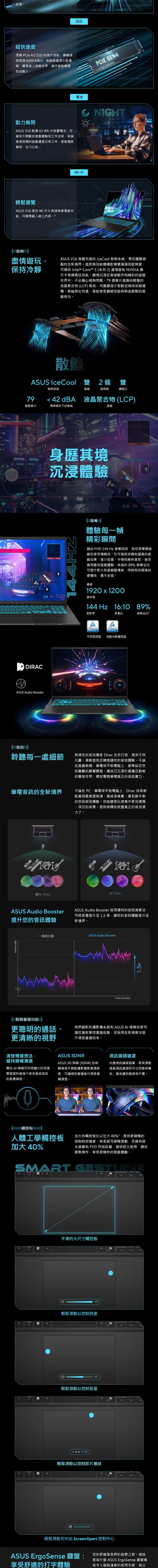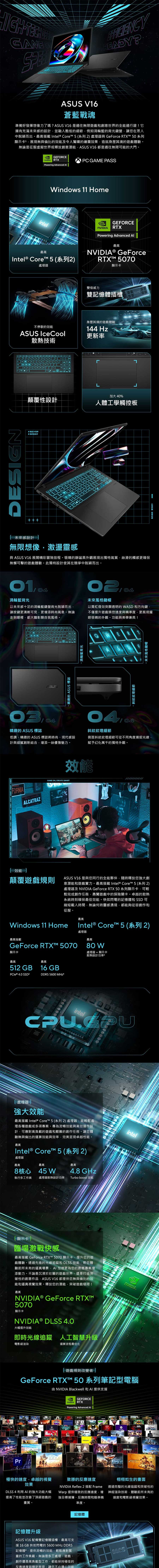 ★搭載最新RTX5000系列 / Intel Core 5處理器 ★雙風扇 / 2散熱管/雙通風口 搭配IceCool散熱 ★最高搭載16:10 144Hz 2.5K IPS / 89%屏佔比 ★藍光背光鍵盤搭配WASD 上下左右透明 ★PD充電 / HDMI 2.1 / 軍規認證 / 180度開合 ★ASUS Audio Booster放大音量1.5X / 可擴充Ram