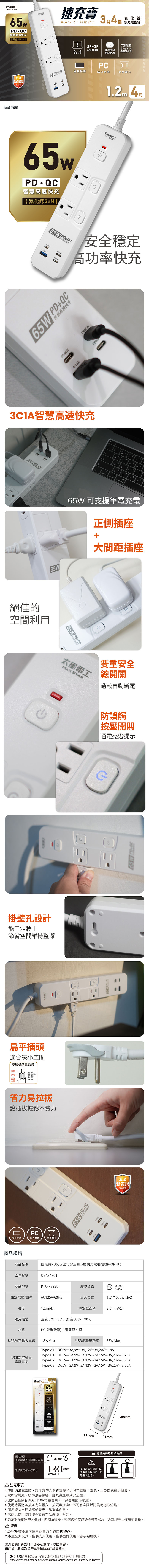 驗證登錄 : R31554 RoHS 商品型號 : KTC-P322U 額定電壓 / 頻率 : AC125V/60Hz 最高負載: 15A 1650W Max USB額定輸入電流 : 1.5A Max USB總輸出功率:65W Max USB額定輸出電壓電流: Type-A1:DC5V? 3A,9V? 3A,12V? 3A,20V? 1.8A Type-C1:DC5V? 3A,9V? 3A,12V? 3A,15V? 3A,20V? 3.25A Type-C2:DC5V? 3A,9V? 3A,12V? 3A,15V? 3A,20V? 3.25A Type-C3:DC5V? 3A,9V? 3A,12V? 3A,15V? 3A,20V? 3.25A 長度 : 1.2M/4尺 適用環境 : 溫度0?C~55?C 濕度30%~90% 導線截面積 : 2.0mm²X3 材質 : PC(聚碳酸酯)、銅 原產地:中國