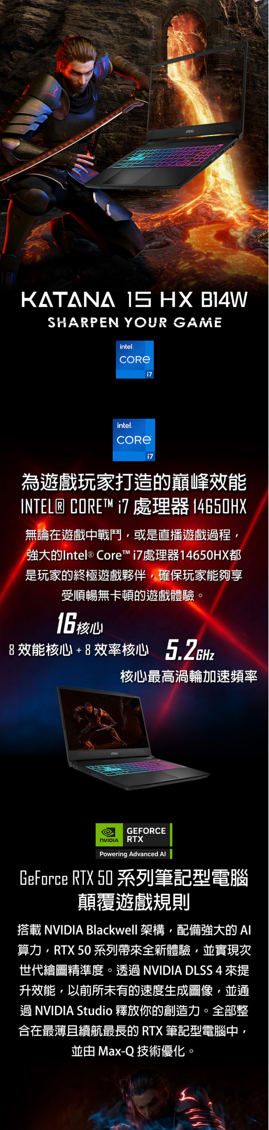 公司料號:Katana 15 HX B14WGK-647TW-BB71465X16GXXDX11MA 國際條碼:4711377386012 螢幕尺寸及解析度:15.6" QHD (2560x1440), 165Hz, IPS-Level 處理器:Intel☆ Core™i7-14650HX (2.2GHz/Turbo 5.2GHz)(Cache 30MB) 主機板晶片:Intel☆ HM770 主記憶體:16GB(16GB*1) DDR5-5600 ,2Slots ,Max 96GB 硬碟:1TB M.2 SSD (NVMe PCIe Gen4) 顯示晶片規格:GeForce RTX™ 5070 Laptop GPU 8GB GDDR7 插槽:2 Slots Number of SO-DIMM Slot 1x M.2 SSD slot (NVMe PCIe Gen4) I/O連接埠:1x Type-C (USB3.2 Gen2 / DisplayPort™/ Power Delivery 3.0) 3x Type-A USB3.2 Gen2 1x HDMI™ 2.1 (8K @ 60Hz / 4K @ 120Hz) 1x RJ45 視訊鏡頭:HD type (30fps@720p) 音效:2x 2W Speaker 1x Mic-in/Headphone-out Combo Jack 光碟機: --- 支援網路:Gb LAN 802.11 ax Wi-Fi 6E Bluetooth v5.3 鍵盤/輸入裝置:4-Zone RGB Gaming Keyboard with Copilot Key 電池:4-Cell 75 Battery (Whr) 變壓器:240W adapter 作業系統:Windows 11 Home 尺寸及重量:359 x 262 x 25.5 mm 2.4 kg 保固:2年保固 台灣地區2年到府收送 免費客服電話0800-018880 配件:無 BSMI:CI33406008C242 商檢證號:MS-1587