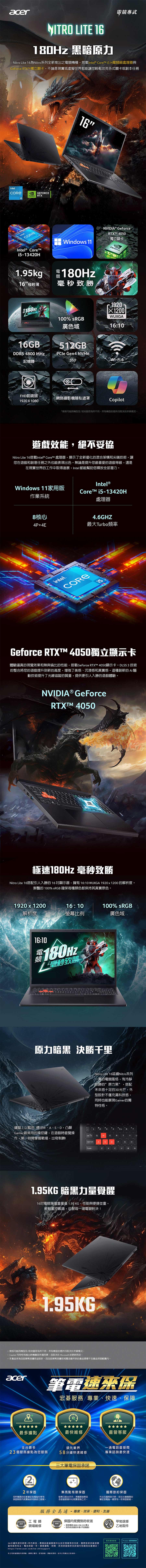 作業系統:Windows 11 Home CPU:Intel® Core™ i5-13420H clock/Turbo:2.1 GHz/4.6 GHz Cores/Threads:8/12 Smart Cache:12 MB 晶片組:N LCD : 尺寸/規格:16" 16:10/IPS/180Hz/LED背光 解析度:WUXGA 1920 x 1200 色域:sRGB 100% 亮度:400 nits 顯示晶片:NVIDIA® GeForce RTX™ 4050 VRAM:6G-GDDR6 風扇:2 熱導管:2 記憶體: 實際出貨:8(Onboard) 8GB DDR5 支援容量(總插槽數量/總容量):1/40GB 儲存空間: 實際出貨:512GB PCIe Gen4 SSD 支援擴充空間(包含已安裝部分): 光碟機:N built in speaker:Y Built-in microphone:Y 鍵盤:白色背光 Webcam:2M FHD Camera "無線網路:Wi-Fi 6 802.11a/b/g/n/ac ax Dual Band (2.4 GHz and 5 GHz) 2x2 MU-MIMO" 藍牙:Bluetooth® 5.0 區域網路RJ-45:Gigabit Ethernet Kensington lock slot:Y 尺寸(mm):362.2 (W) x 248.47 (D) x 22.9/22.9 (H) mm 材質:塑膠 重量:1.95 kg 電源變壓器:100W TypeC 電池:53Wh battery "Battery Life:Up to 7 hours (video playback) Up to 9.5 hours (web browsing)" Input/OutputCard Reader:N USB Type-C:1(USB 3.2 Gen 2)(Thunderbolt 4)(DC-in 20 V; 65 W) Type-C 支援影像傳輸:Y USB Type-A:2(USB 3.2 Gen 1) HDMI:Y(HDMI 2.1) External display (VGA) port:N DisPlay Port:N 可外接螢幕數量:2 耳機/喇叭輸出:Y(與耳機/喇叭輸出共用jack) 麥克風輸入:Y(與耳機/喇叭輸出共用jack) 安全指紋辨識:N TPM:N 保固:台灣2年