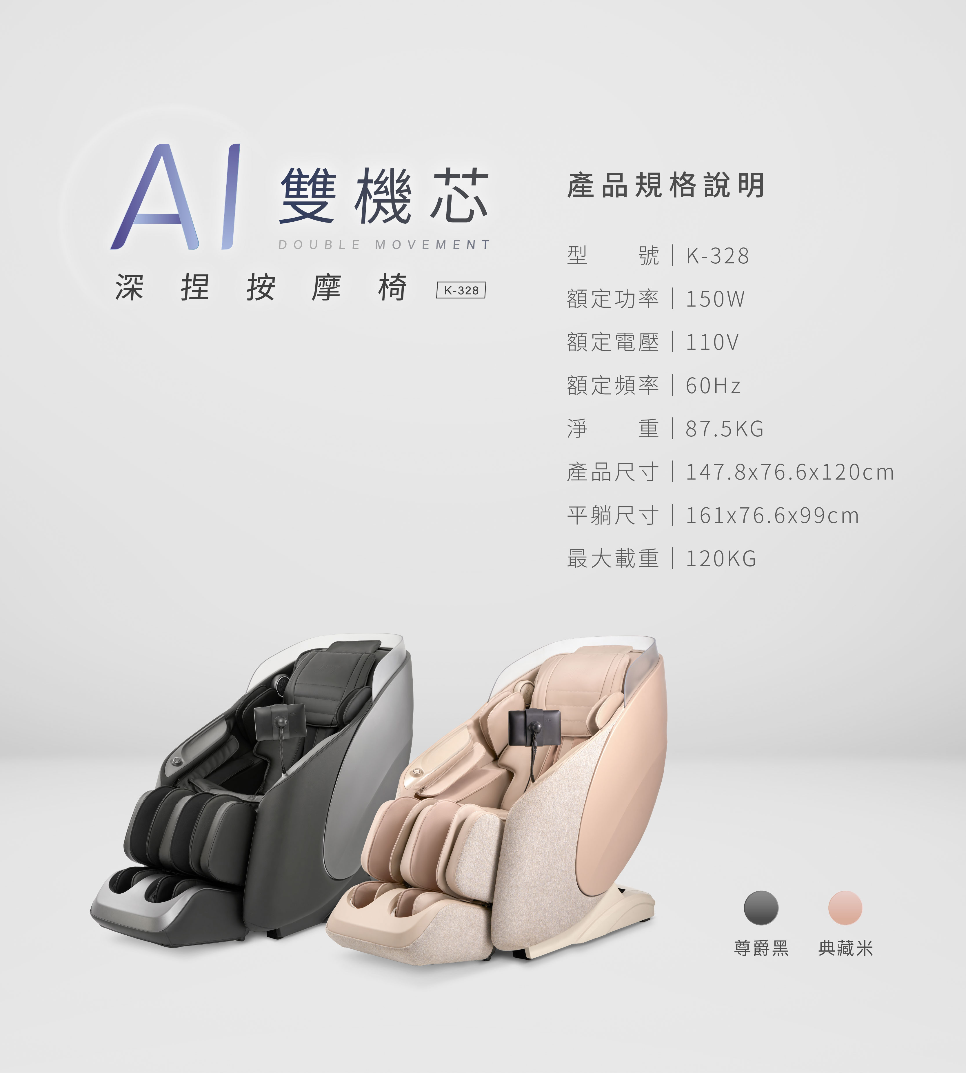 品 牌:JHT 型 號:K-328 名 稱:JHT Ai 雙機芯深捏按摩椅 顏 色:尊爵黑/典藏米 產品尺寸:147.8x76.6x120cm 平躺尺寸:161x76.6x99cm 額定電壓:110V 額定頻率:60Hz 額定功率:150W 淨 重:87.5kg 最大載重:120kg 產 地:中國