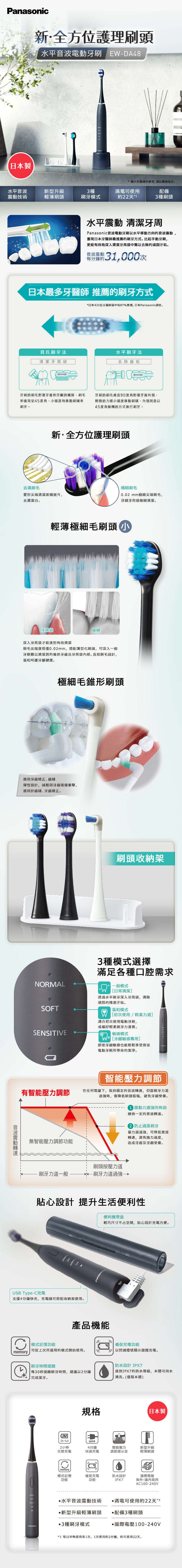 ◆電壓 : 100-240V (國際電壓) ◆電池類型:鋰電池 ◆充電時間 : 約2小時 ◆操作時間 : 總使用時間約90分鐘,約22天 (每天使用2次、每次2分鐘計算) ◆內附刷頭:全方位護理刷頭WEW0810-K*1 極細毛刷頭(小)WEW0800-K*1 細毛錐形刷頭WEW0961-W*1