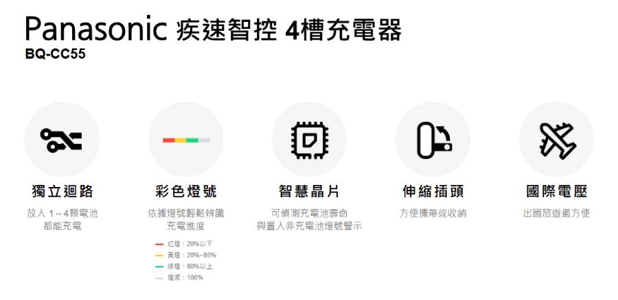輸入電壓 100-240 充電電池內容物 AAA 是否可充電 可充電 內容物 BQ-CC55TW鎳氫電池充電器*1 BK-4HCCE鎳氫充電4號電池*2