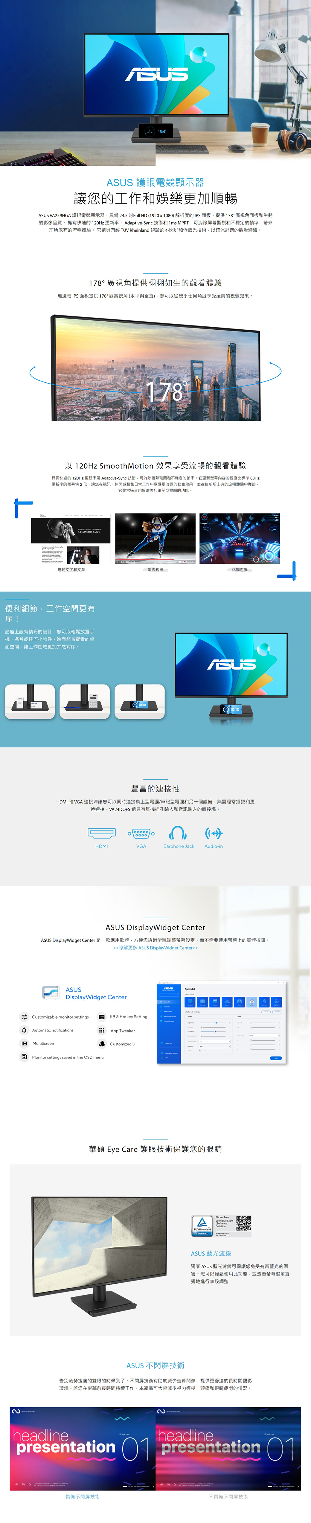 Trace Free 無殘影技術:Yes SPLENDID 影像預設模式:Yes 色溫選擇:有(4 種模式) GamePlus :支援 QuickFit (模式):Yes 支援HDCP:支援, 1.4 可變更新率 (VRR):支援 (Adaptive-Sync) Motion Sync : Motion Sync : 支援 應用軟體 DisplayWidget :支援, DisplayWidget Center 低藍光模式:有 Eye Care 護眼技術:有 ASUS Power Sync : Yes