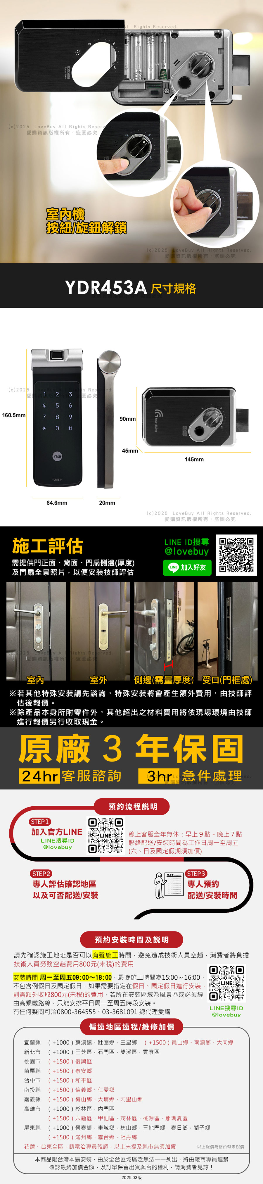=====注意事項===== ◆電子產品請遠離水源。 ◆使用前請詳閱使用說明書。 ◆若辦理退貨,安裝鑽孔無法回復。 ◆為提升安全性,建議定期更改使用者密碼。 ◆請勿自行拆解,避免觸電及造成機器損壞。 ◆請使用四顆3號(AA)鹼性電池,請勿使用充電電池。 ◆電池壽命會依溫度、濕度、使用頻率及電池品質而有差異。 ◆如長期不使用,請將電池取出,避免電池漏液造成機器損壞。 ◆玻璃材質、門板3.5公分以下、5.5公分以上因厚度問題無法安裝。