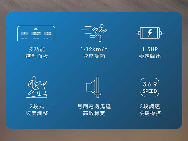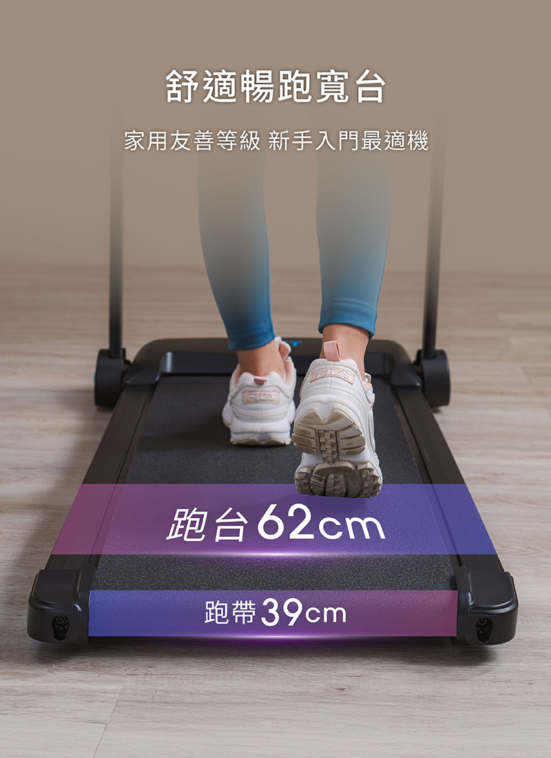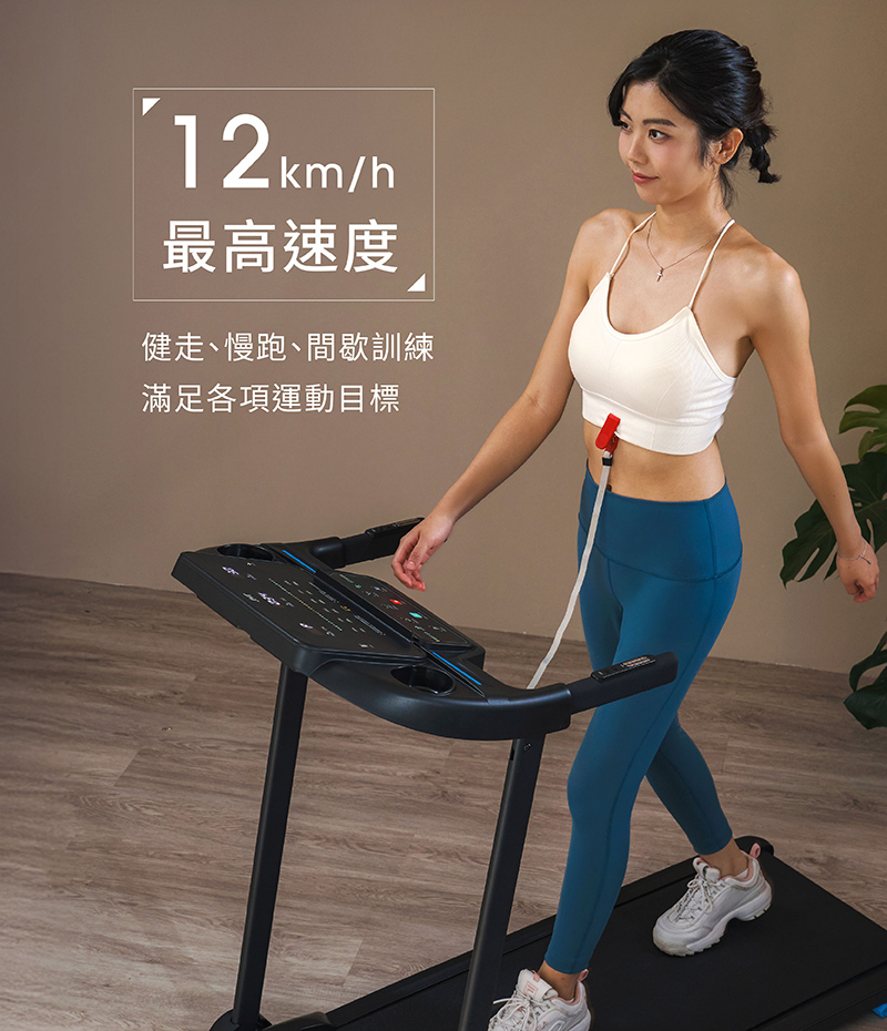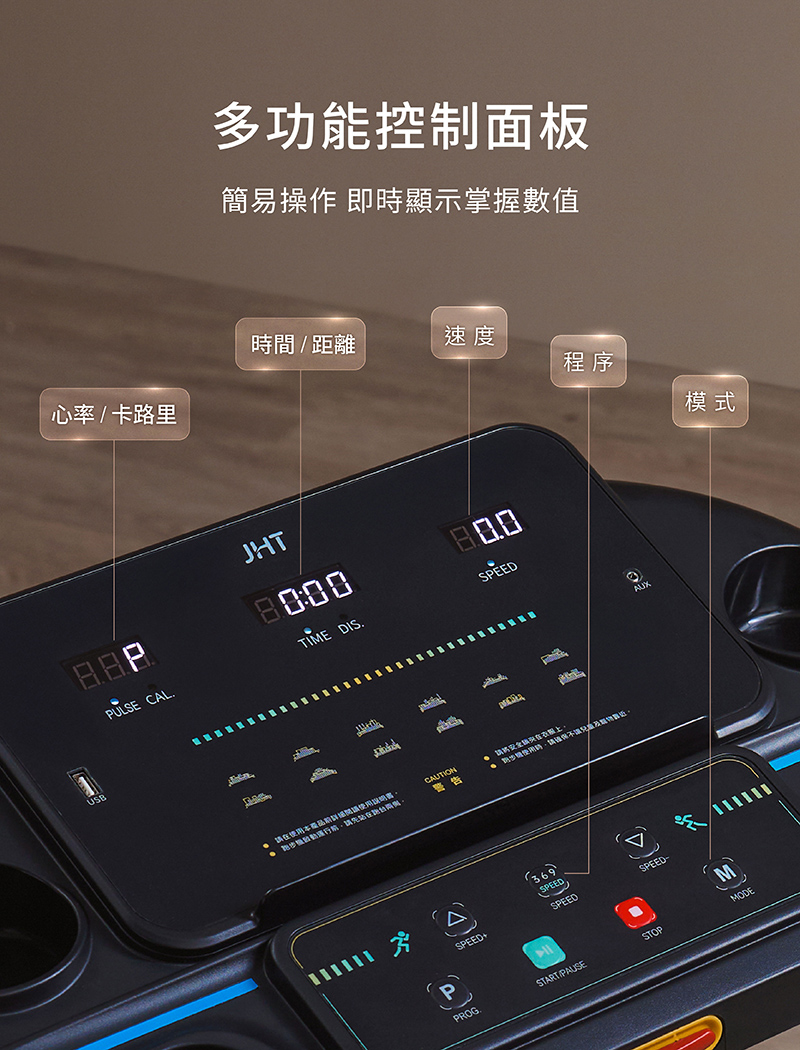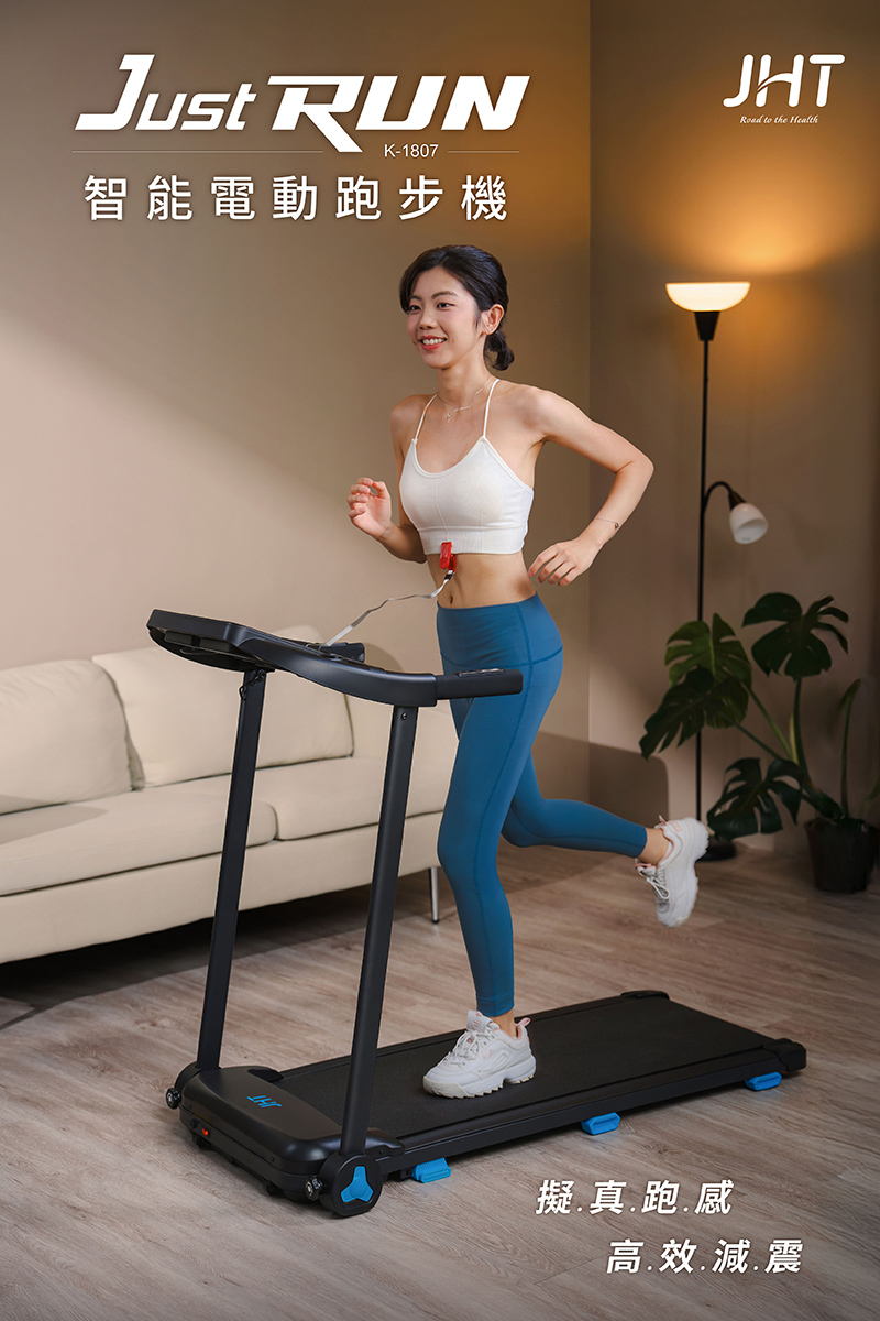 品 牌:JHT 型 號:K-1807 名 稱:JustRun智能電動跑步機 顏 色:黑 額定電壓:110V 額定頻率:50/60Hz 額定功率:1125W 淨 重:27kg 展開尺寸:127.2x62x105.4cm 摺疊平放尺寸:124.7x62x15.5cm 跑帶尺寸:105x39cm 最大載重:90kg 產 地:中國
