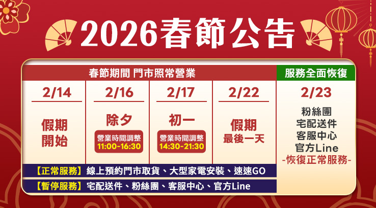 春節期間燦坤全省門市照常營業,門市營業時間及線上購物服務調整如下: